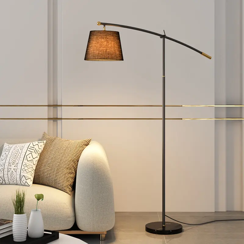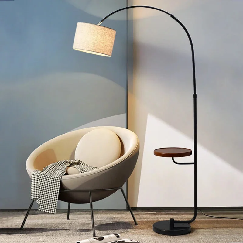 Black Arched Floor Lamp with Wooden Tray and Marble Base